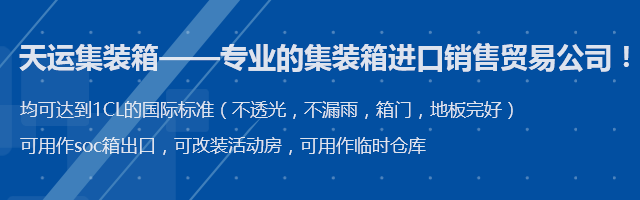青島天運(yùn)集裝箱服務(wù)有限公司,是專業(yè)的集裝箱(進(jìn)口和出口)銷售租賃貿(mào)易公司,公司與各大船公司租箱公司保持著密切的合作關(guān)系,箱源充足,所有出售集裝箱均可達(dá)到CW適貨標(biāo)準(zhǔn)或IICL的國際標(biāo)準(zhǔn)(不透光,不漏雨,箱門,地板完好)可用作soc箱出口,可改裝活動房,可用作臨時(shí)倉庫。